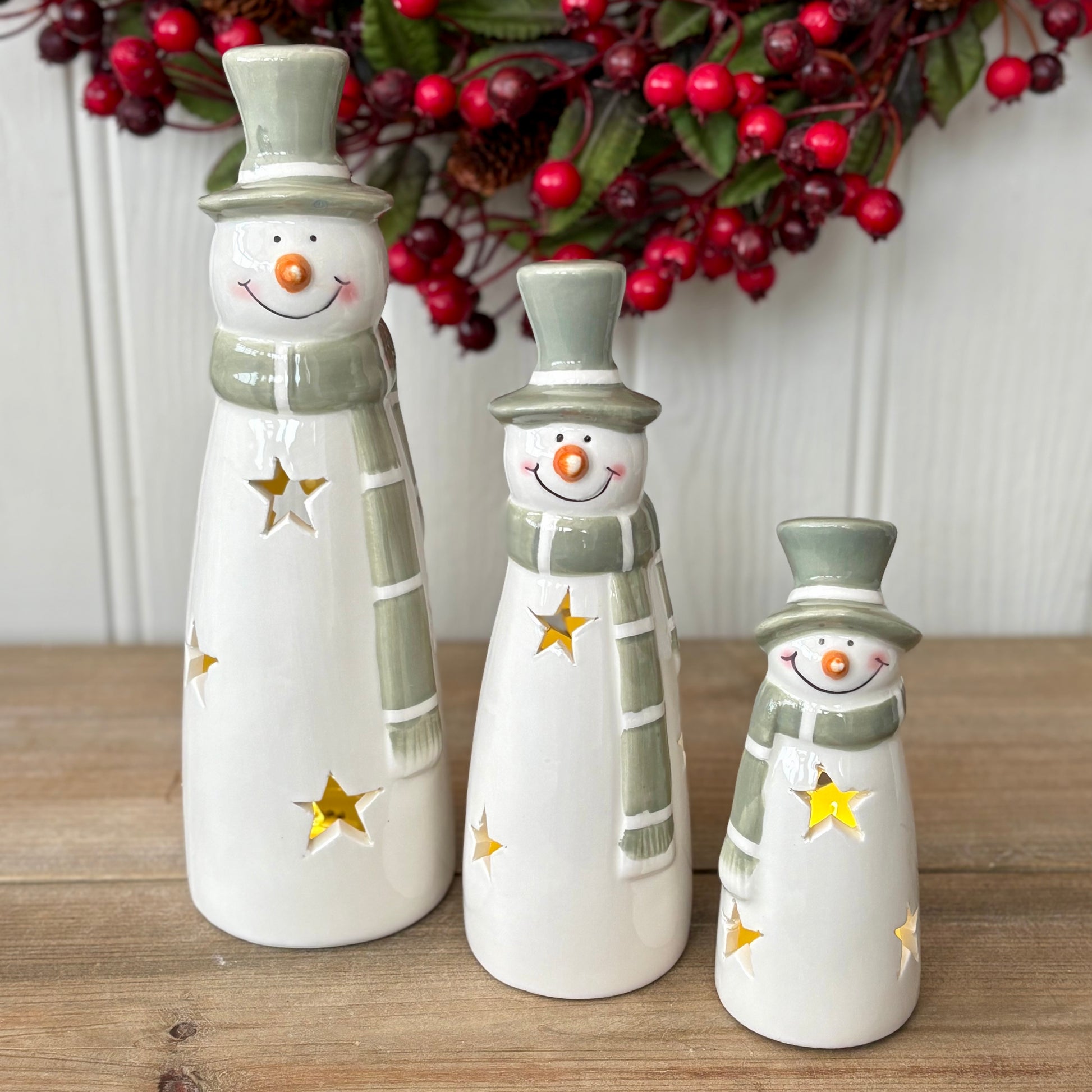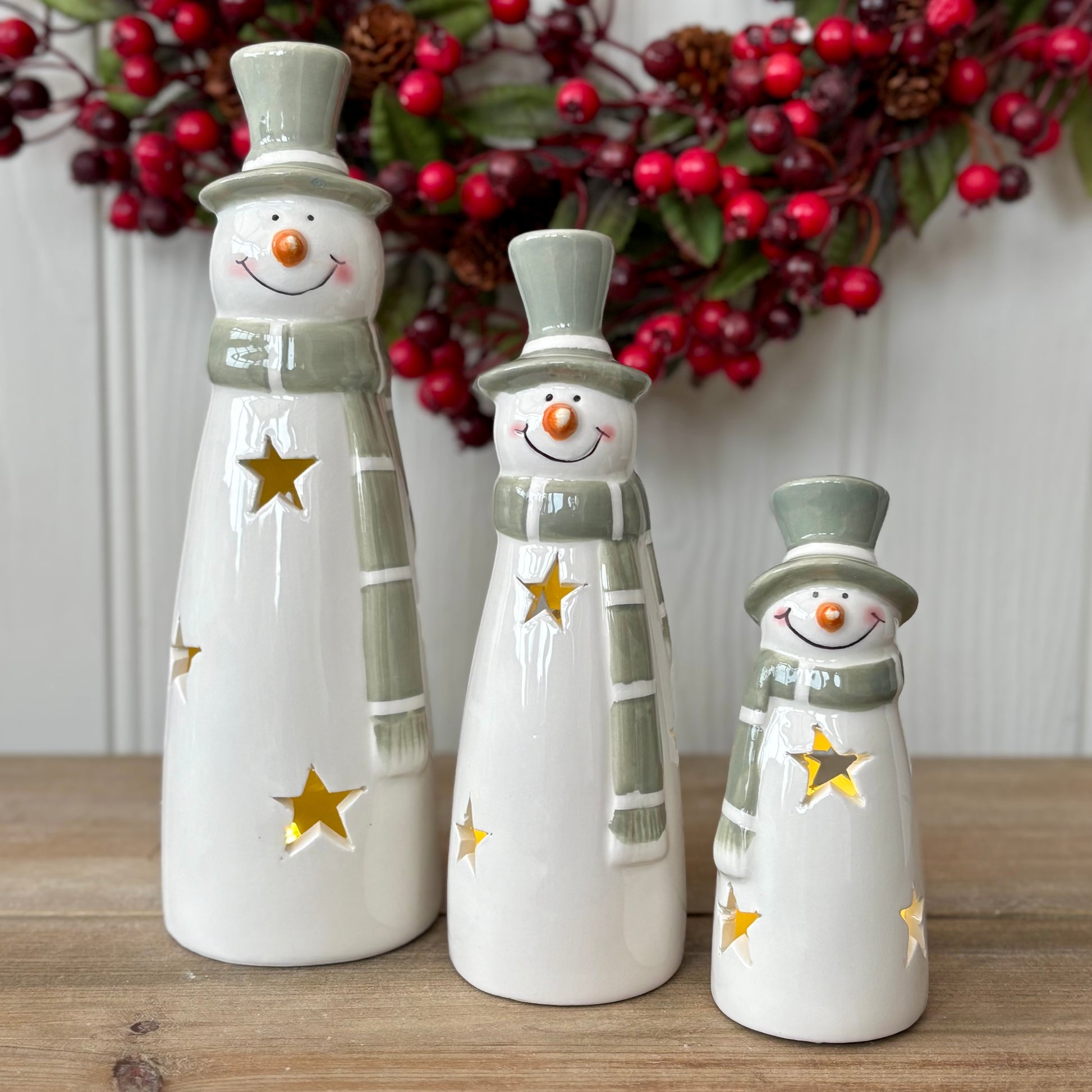 Bring a frosty glow into your home this festive season with these charming ceramic snowman decorations. Each snowman wears a green top hat and matching scarf, with star cut-out details that softly glow when lit from within. Their cheerful faces and cosy design add the perfect mix of Christmas charm and festive warmth.