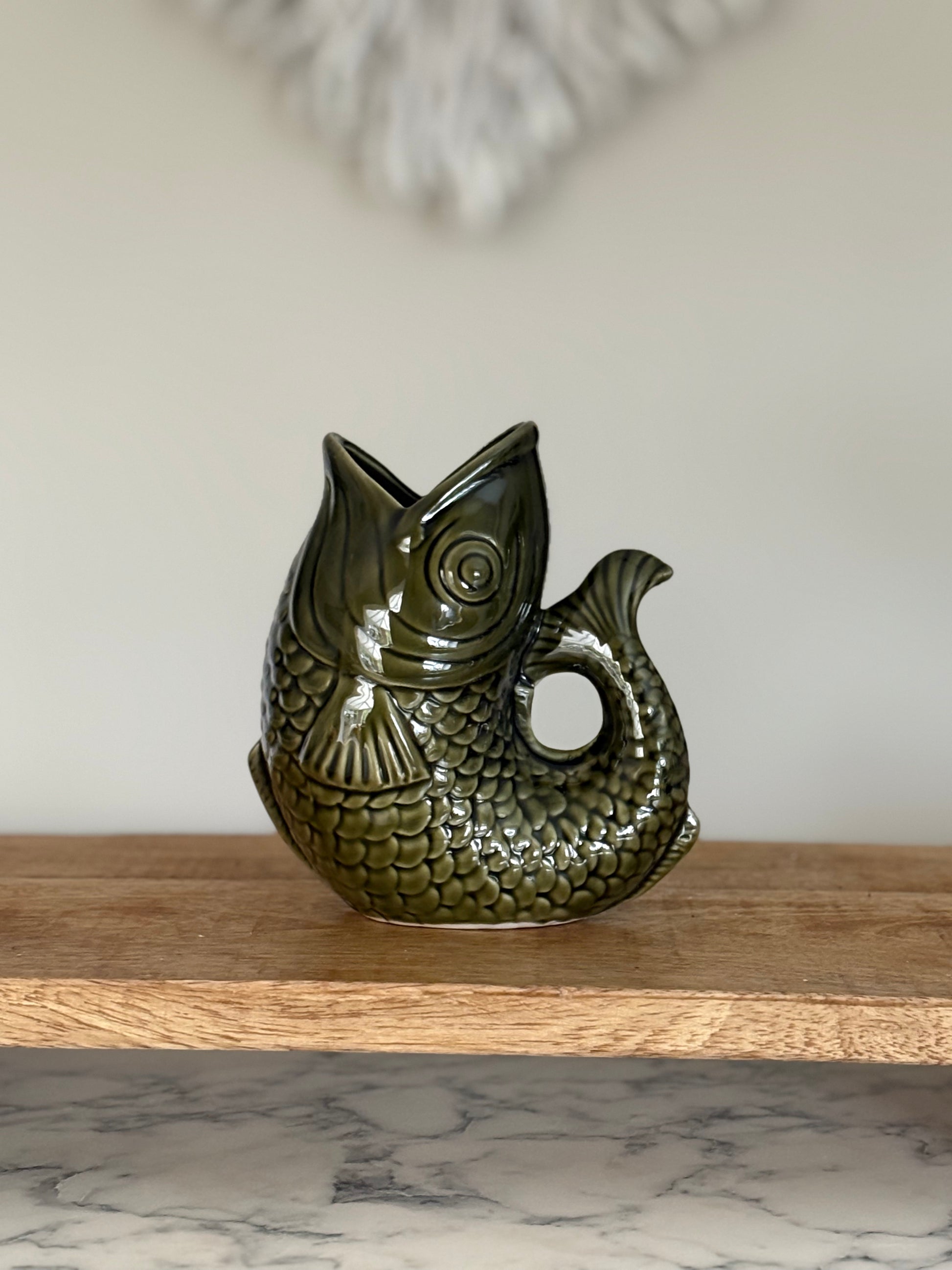 Bring a touch of seaside charm and vintage-style flair to your home with this beautiful forest green ceramic Glug Jug, available in three sizes. Crafted in the shape of a fish, this glossy pitcher makes a delightful 'glug-glug' sound when pouring - a fun and classic design feature that’s been beloved for generations.