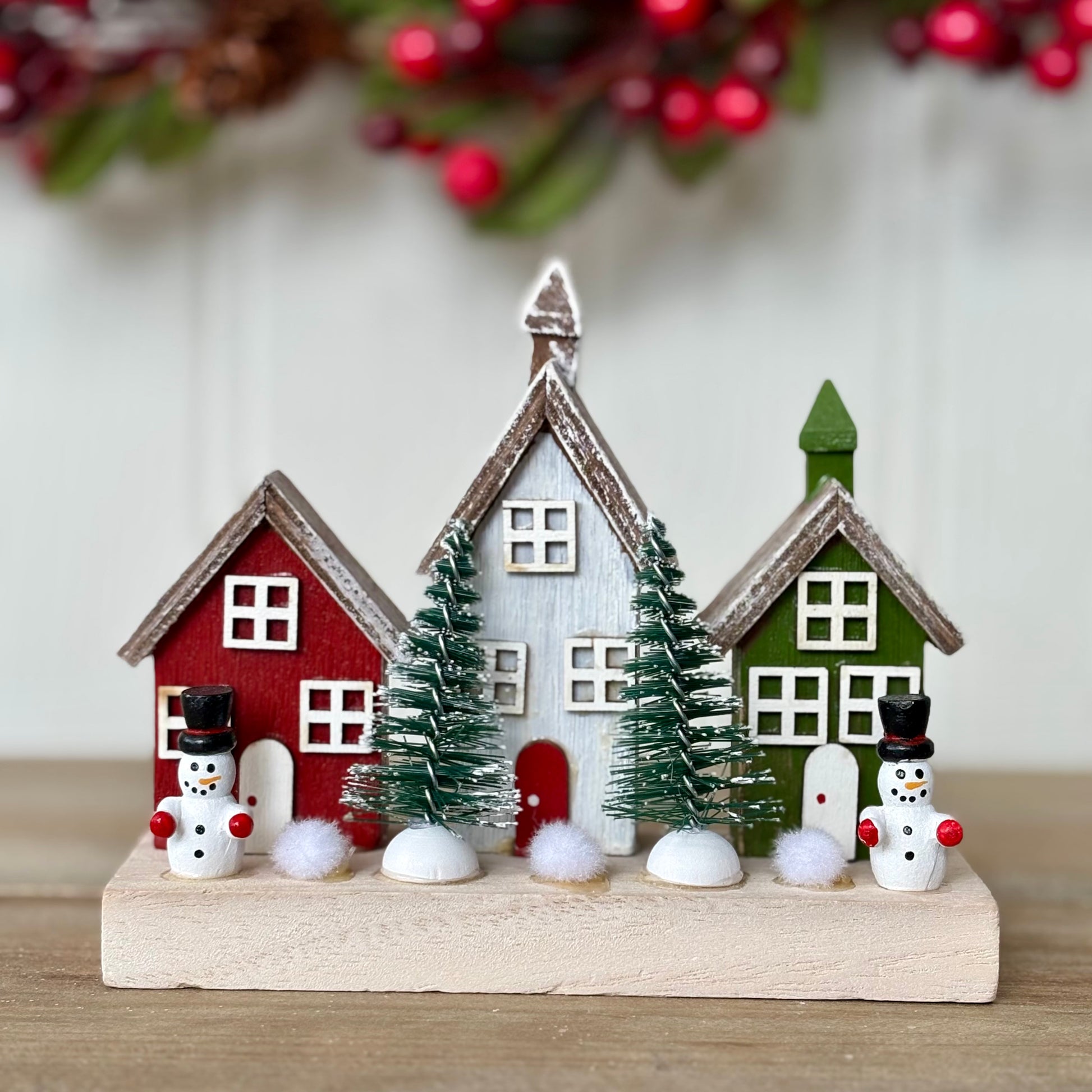 Create a cosy festive display with this rustic wooden Christmas village scene. Featuring three painted houses in red, white, and green with snowy rooftops, bottle-brush trees, fluffy snowballs, and two cheerful snowmen, this decoration captures the joy of a traditional Christmas.